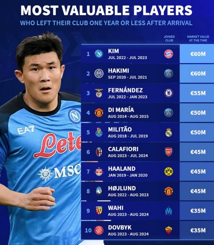 3月1日讯 《转会市场》统计了加盟球队一年内便转会离队的球员身价最贵榜单,金玟哉和阿什拉夫并列居首。