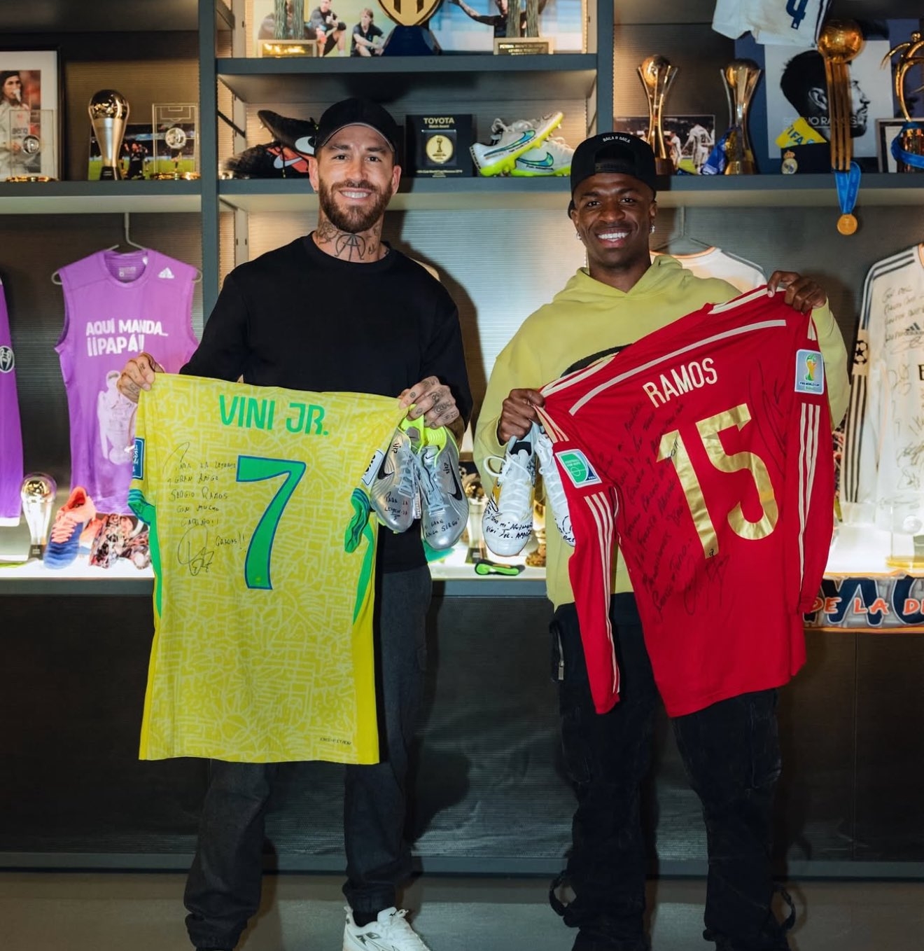 2025-02-21 17:33:46传承!维尼修斯拜访皇马传奇拉莫斯,两人交换国家队球衣