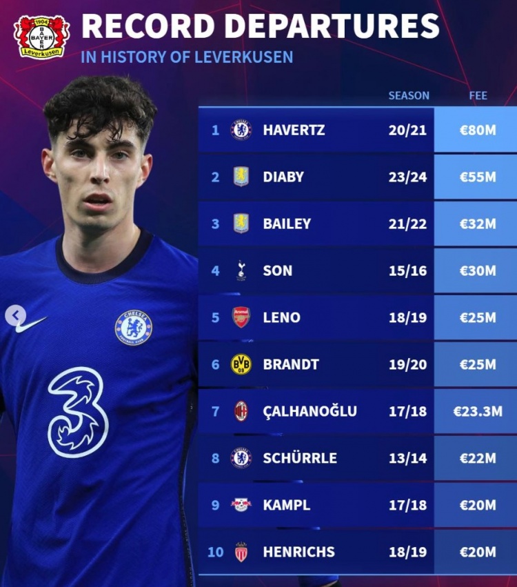 3月2日讯 《转会市场》统计了勒沃库森队史卖人最贵榜,哈弗茨以8000万欧元居首。