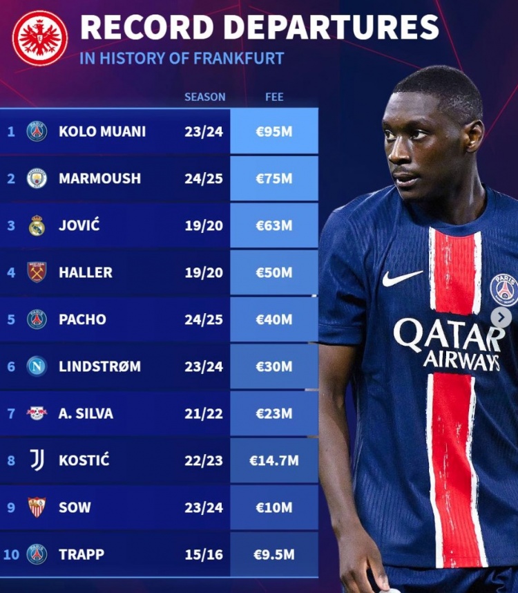 2025-03-02 02:24:57法兰克福队史卖人榜:穆阿尼&马尔穆什领衔,约维奇&阿莱在列