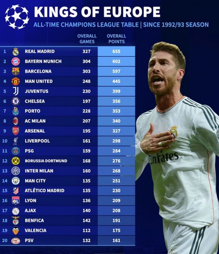 2月21日讯 欧冠淘汰赛附加赛已经结束,《转会市场》也统计了92-93赛季改制后的欧冠历史积分榜,皇马无悬念领跑。