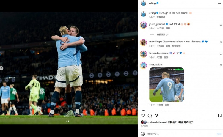 2025-03-02 14:11:25布丁连线再现,哈兰德社媒晒与德布劳内拥抱合影:晋级下一轮!