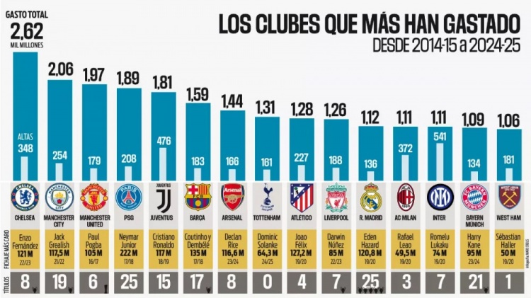 2025-03-02 23:13:05过去十年转会投入榜:切尔西26亿欧第一,英超BIG6&皇萨仁全上榜