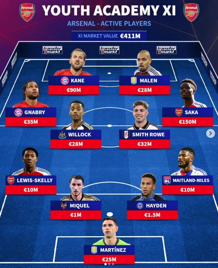 阿森纳青训当前最贵阵:总身价4.11亿欧元