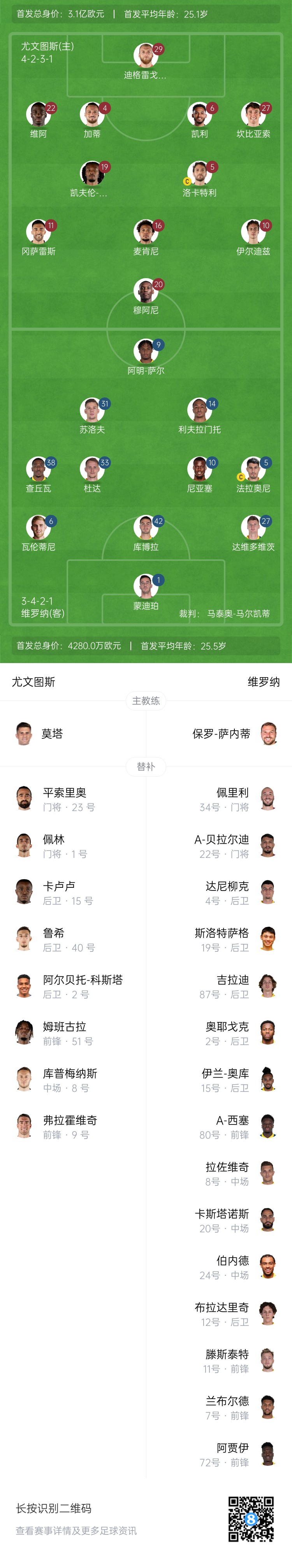 尤文首发:29-迪格雷戈里奥、22-维阿、4-加蒂、6-凯利、27-坎比亚索、5-洛卡特利、19-凯夫伦-图拉姆、10-伊尔迪兹、16-麦肯尼、11-尼古拉斯-冈萨雷斯、20-穆阿尼