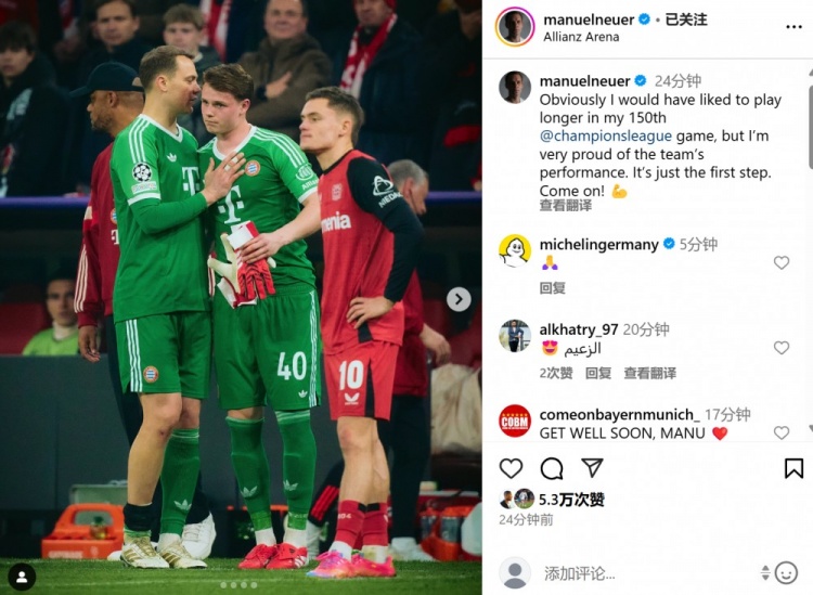 2025-03-06 08:10:54因伤下场,诺伊尔社媒晒照:我本希望在第150场欧冠踢更长时间