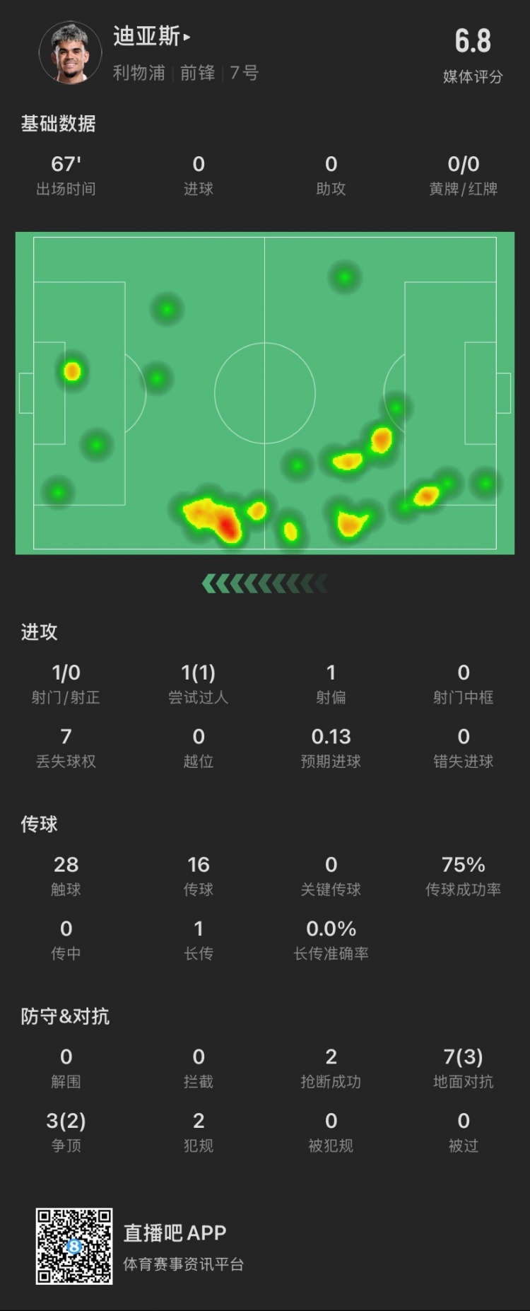 2025-03-06 08:15:25迪亚斯本场:1射门0射正,贡献2抢断,10次对抗成功5次,犯规2次