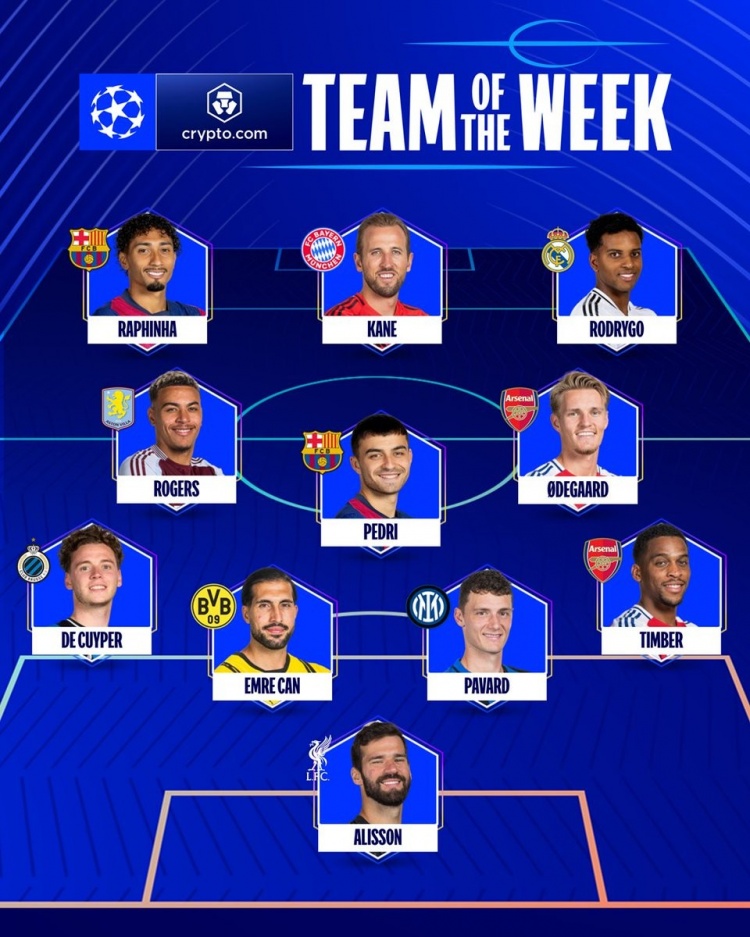 2025-03-07 00:27:38本轮欧冠官方最佳阵:阿利森&厄德高领衔,凯恩&罗德里戈在列
