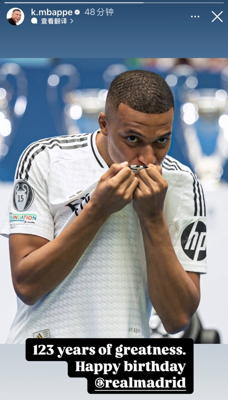 2025-03-07 10:09:17姆巴佩祝贺皇马成立123周年:123年的伟大历史,皇马生日快乐