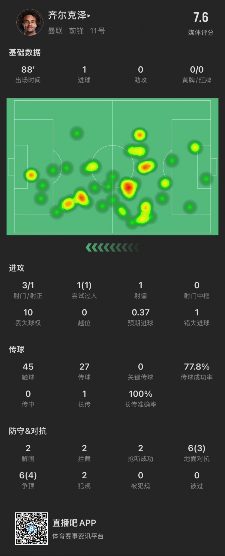 2025-03-07 10:09:57齐尔克泽本场:3射1正进1球,贡献2解围2抢断,12次对抗成功7次