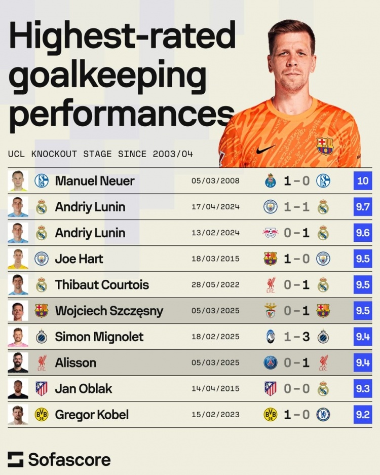 sofascore欧冠淘汰赛历史门将评分榜:03-04赛季以来有统计