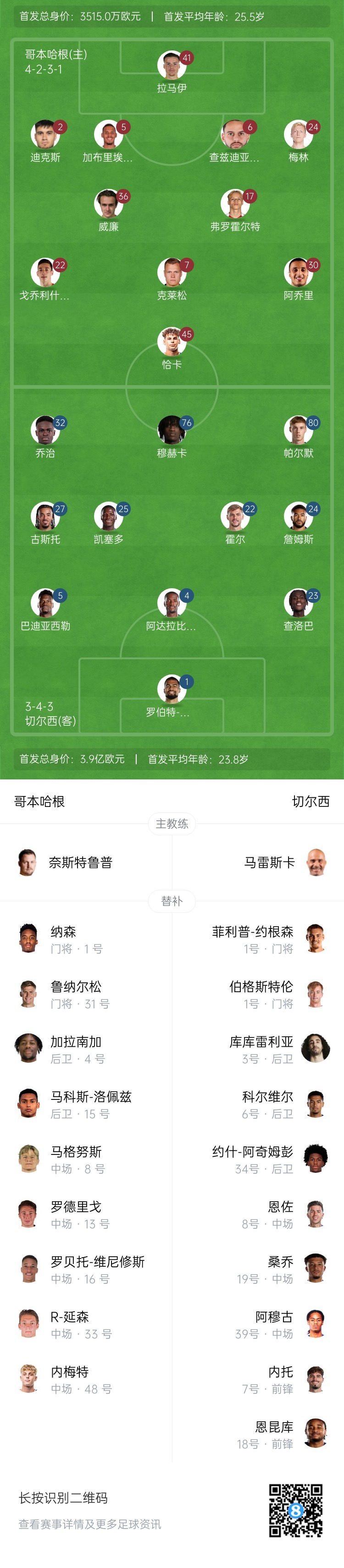 哥本哈根首发:41-拉马伊、2-迪克斯、5-加布里埃尔、6-查兹迪亚科斯、24-梅林、36-威廉-克莱姆、17-弗罗霍尔特、22-戈乔利什维利、7-克莱松、30-阿乔里、45-恰卡