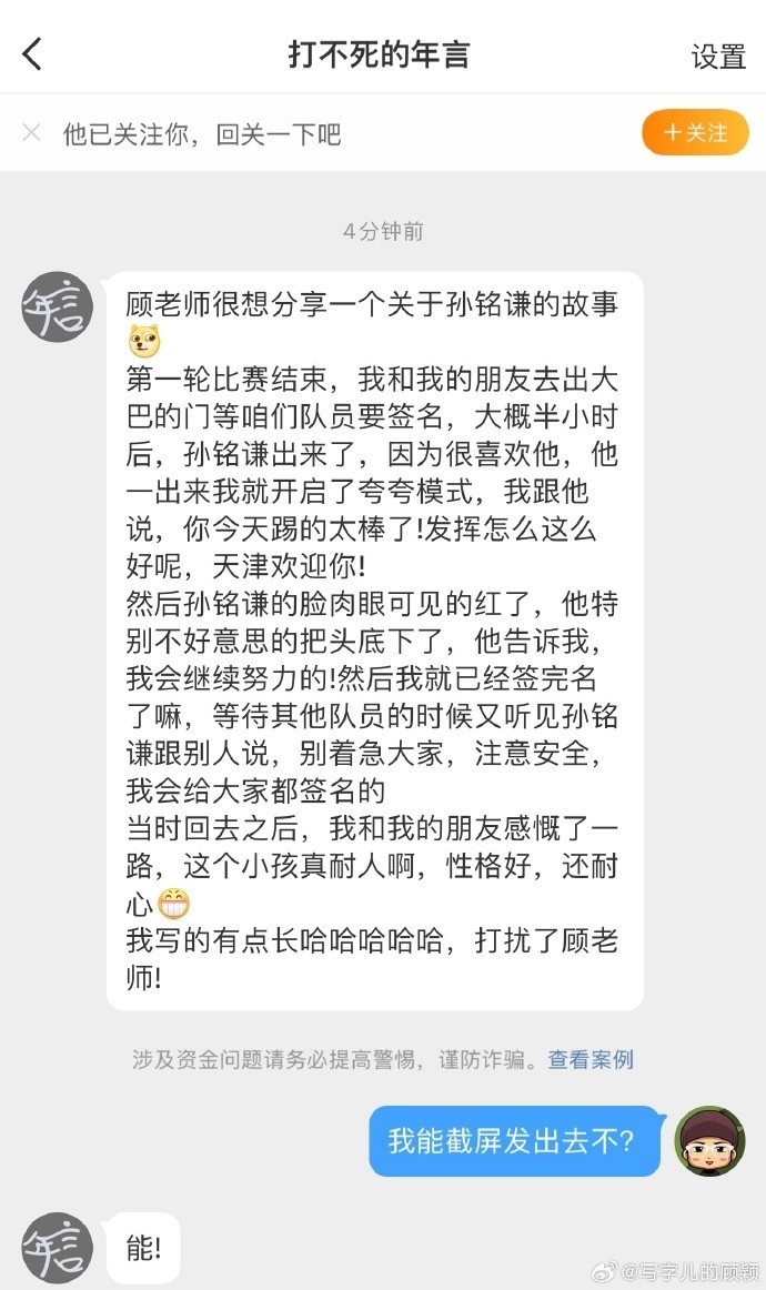3月7日讯 今天,天津记者顾颖在社媒分享了一名球迷与津门虎球员孙铭谦之间的小故事。