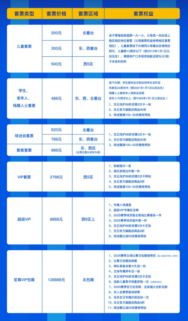 2、关于套票补办:2025赛季全年主场套票,实体套票卡片仅可补办一次,工本费100元。