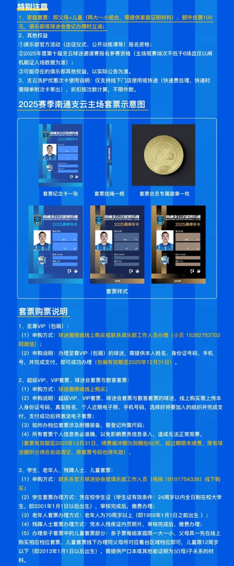 (1)2025赛季南通支云足球俱乐部主场套票先购先得,售罄为止;