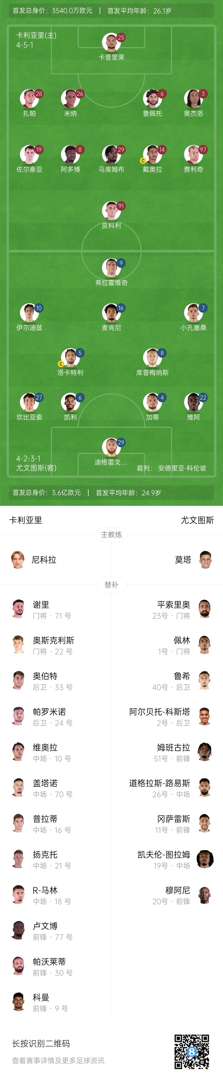 卡利亚里首发:25-卡普里莱、28-扎帕、26-米纳、6-鲁佩托、3-奥杰洛、19-佐尔泰亚、8-阿多博、29-马库姆布、14-戴奥拉、97-奥利奇、91-皮科利
